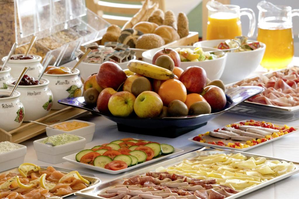 Bufet obejmuje m.in. różne produkty na słodko i słono, świeże składniki i szeroki wybór dań.