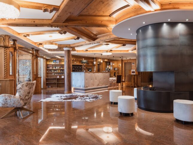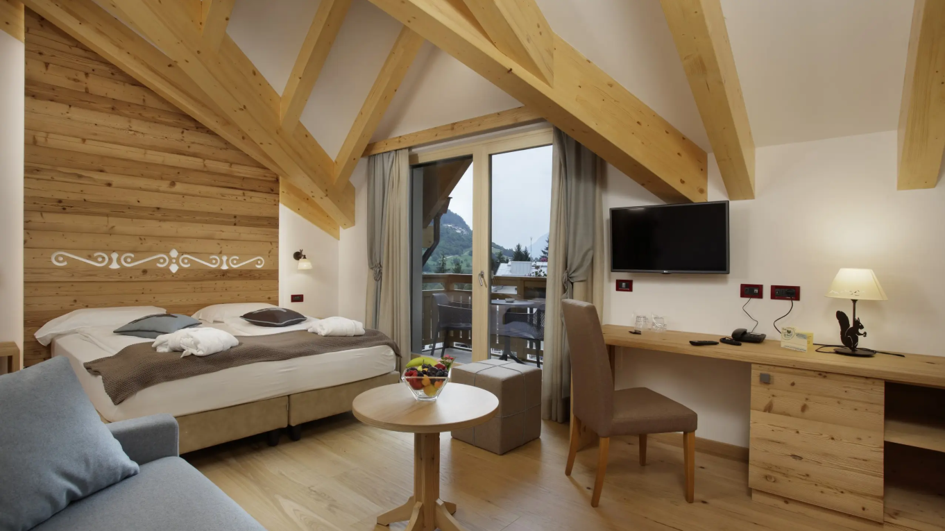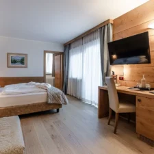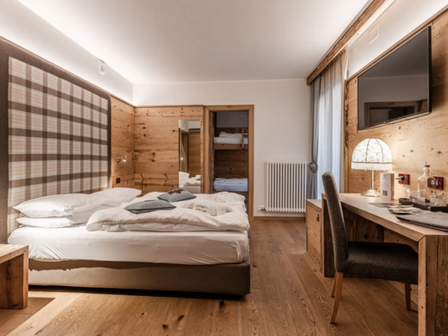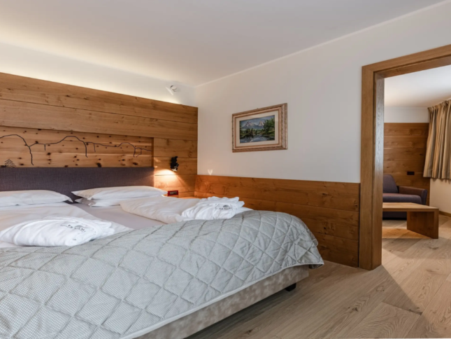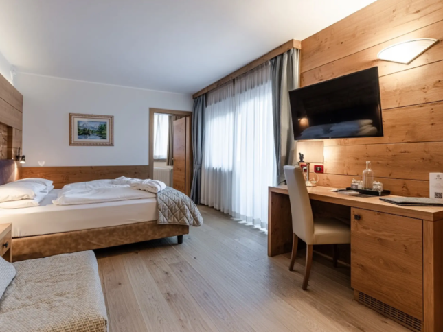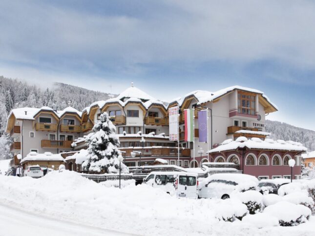 Hotel Tevini to elegancki 4****s‑gwiazdkowy obiekt , zaledwie ok. 300–500 m od dolnej stacji gondoli DaolasaHotelowy skibus
